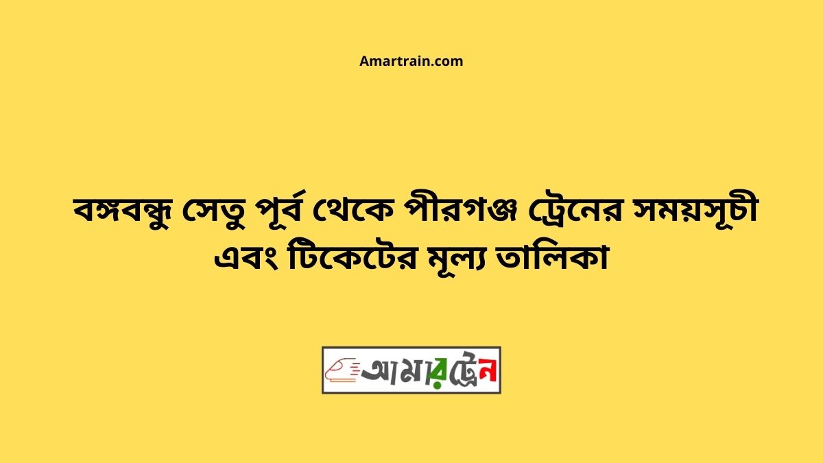 আপনি সহজেই বিবিইস্ট থেকে ট্রেনে পীরগঞ্জ যেতে পারেন। বিবিইস্ট থেকে পীরগঞ্জ রুটে আন্তঃনগর ট্রেন এবং মেইল এক্সপ্রেস ট্রেন রয়েছে। আজ আমাদের কাছে বাংলাদেশ রেলওয়ের উপর ভিত্তি করে টিকিটের মূল্য সহ BBEast থেকে পীরগঞ্জ ট্রেনের সময়সূচী সম্পর্কে বিস্তারিত তথ্য রয়েছে। আসুন এটি পরীক্ষা করে দেখি।