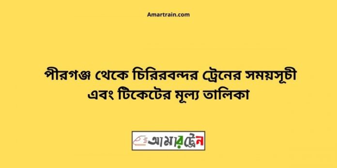 পীরগঞ্জ থেকে চিরিবন্দর পর্যন্ত ট্রেনে সহজেই যাতায়াত করা যায়। পীরগঞ্জ থেকে চিরিবন্দর রুটে আন্তঃনগর ট্রেন এবং মেইল এক্সপ্রেস ট্রেন পাওয়া যায়। আজ আমাদের কাছে বাংলাদেশ রেলওয়ের ভিত্তিক টিকিটের মূল্য সহ পীরগঞ্জ থেকে চিরিবন্দর ট্রেনের সময়সূচী সম্পর্কে বিস্তারিত তথ্য রয়েছে। আসুন এটি পরীক্ষা করে দেখি।